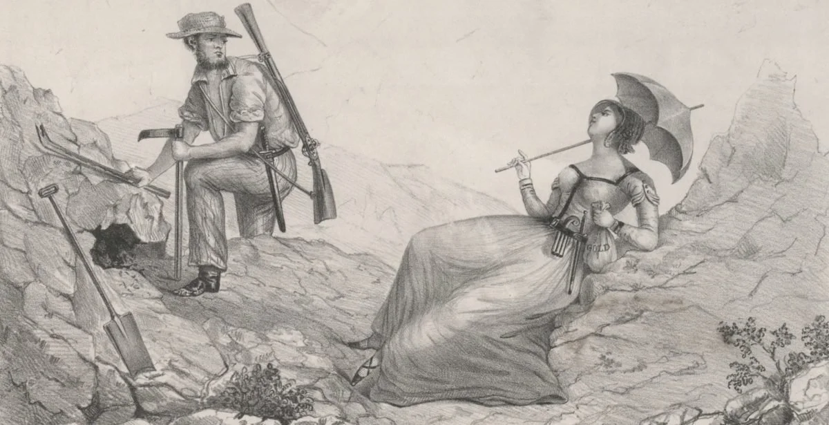 I learned about Samuel S. Brannan and compared his approach to fellow outfitter Levi Strauss. Brannan led me to investigate the role the Latter Day Saints Church played in westward expansion. I read that Levi Strauss never married, which caused me to speculate about his sexuality and look for primary sources. I went spelunking for newspaper illustrations depicting women’s role in the California Gold Rush, which gave me this gem, but also … what the hell was I doing?