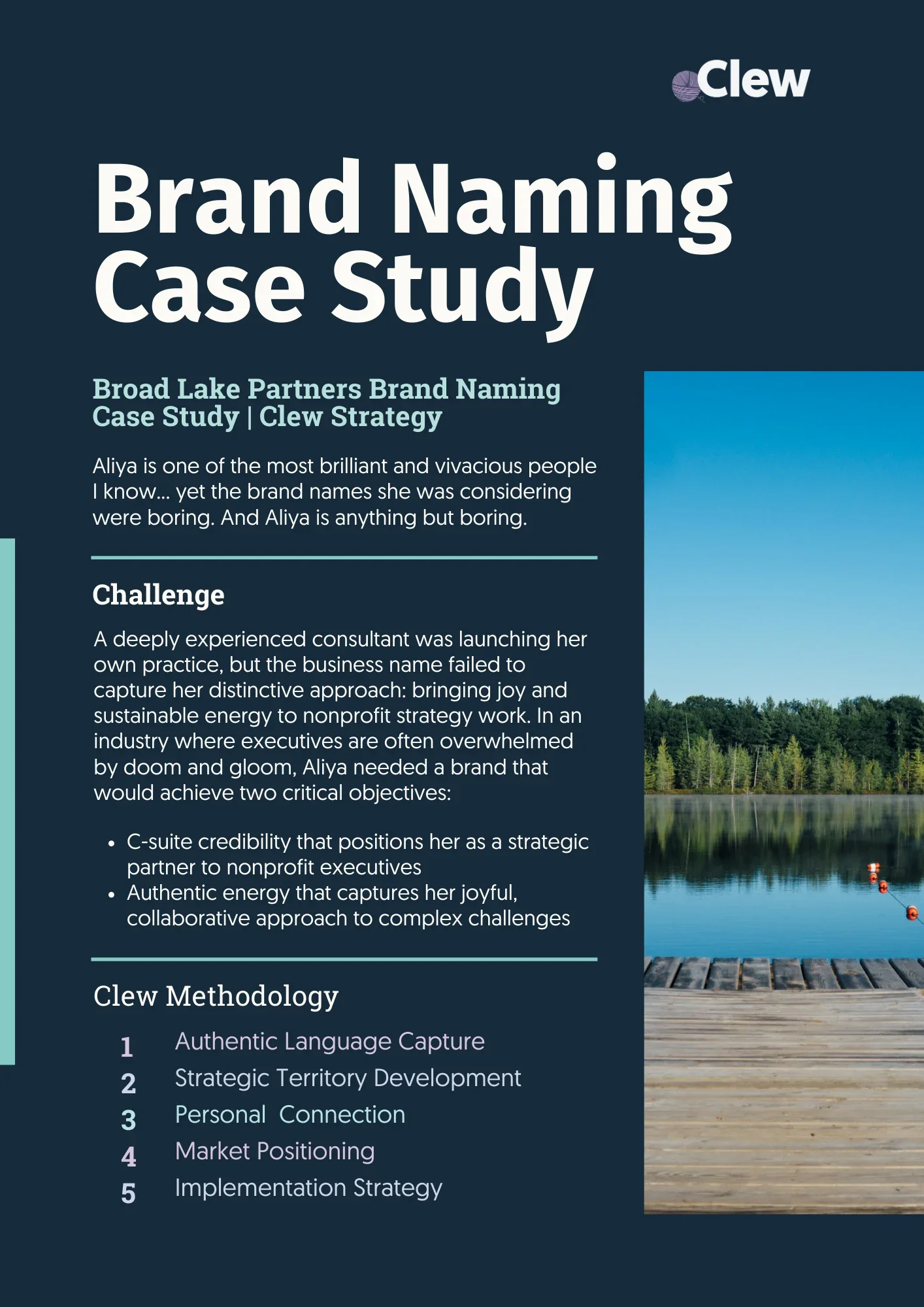 Click the Case Study image to view a two-page version of the Broad Lake Partners naming case study, or read the blog post for an in-depth look at how the Clew naming methodology helping a high-energy nonprofit consultant evolve her brand from generic to cheeky and distinctive.